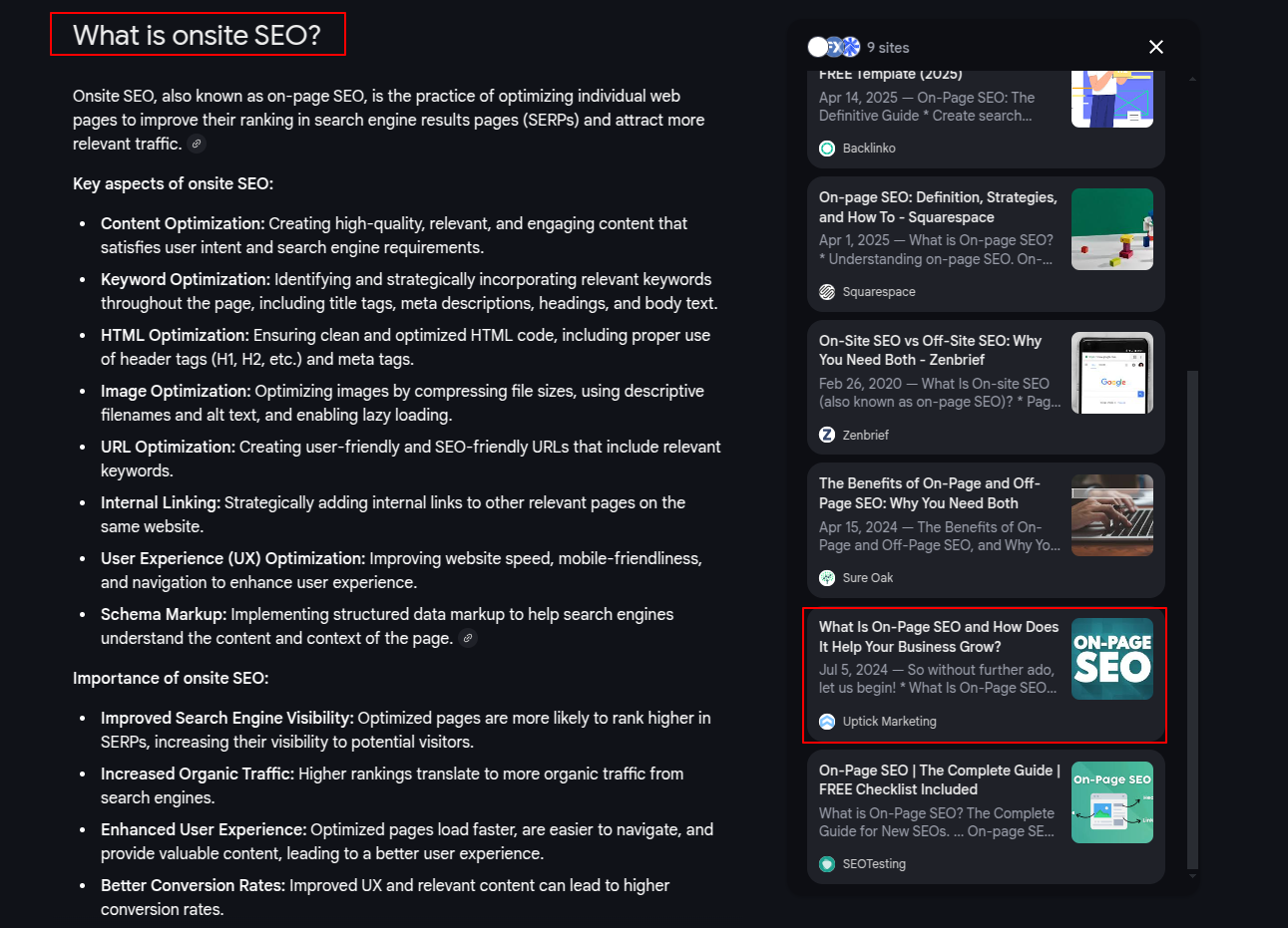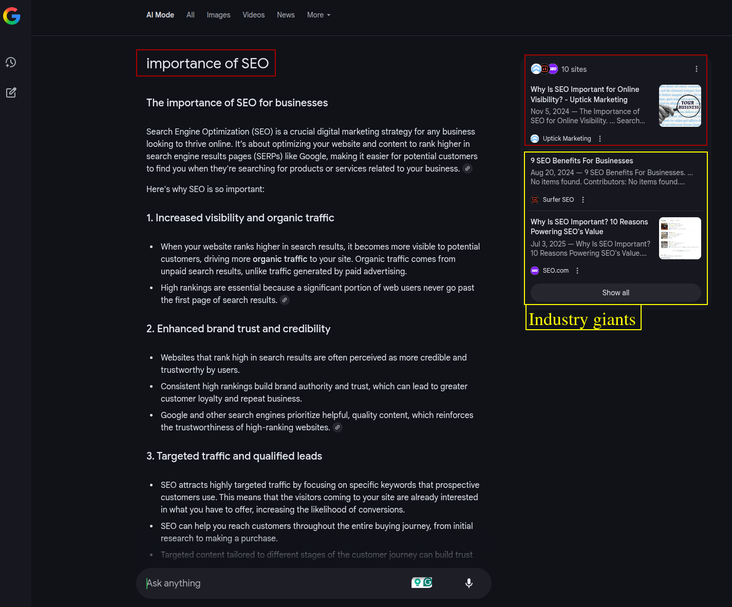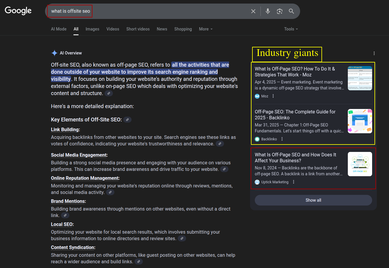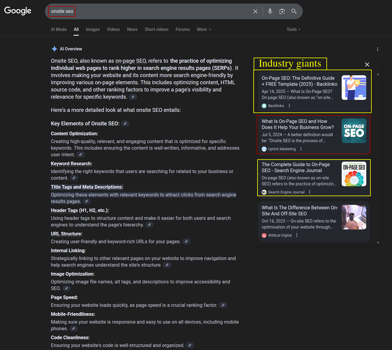 No, AI Overviews and AI Mode are not only for the giants (at least not yet). In fact, in some ways, they make it easier to rank. For example, our ranking for “onsite SEO” is the 24th result as of the writing of this article (that’s the third page, if you can believe such a place exists). If not for AI Overviews and AI Mode, no one would know our content exists (this is an insanely competitive query and we’re going toe to toe with the titans of our industry).